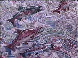 rappresenta salmoni. Al suo centro, sospesi nel cielo e al di sopra